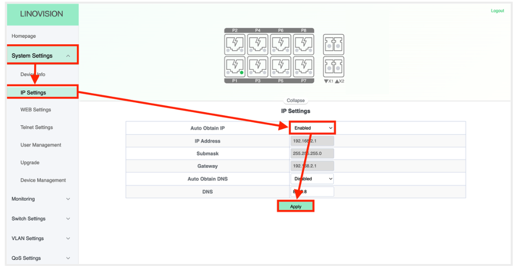 Switch Settings | Port Settings | Status Speed / Duplex / Flow Control |