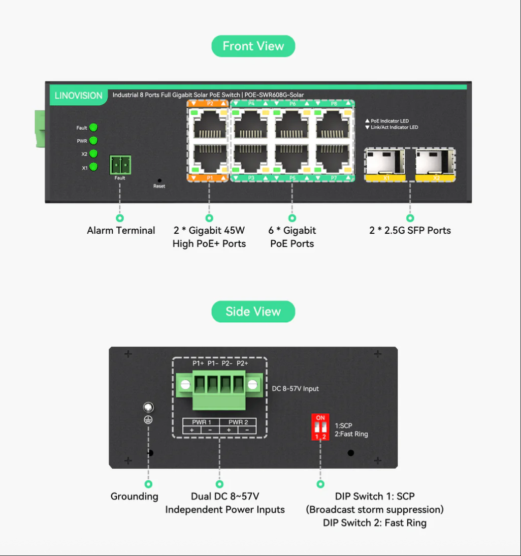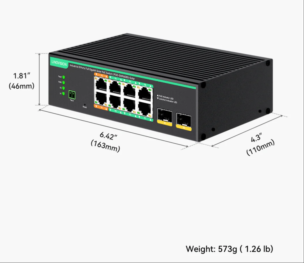 Port Panel (two colors distinguish speed) | 1000M green 100M/10M orange‑yellow | |